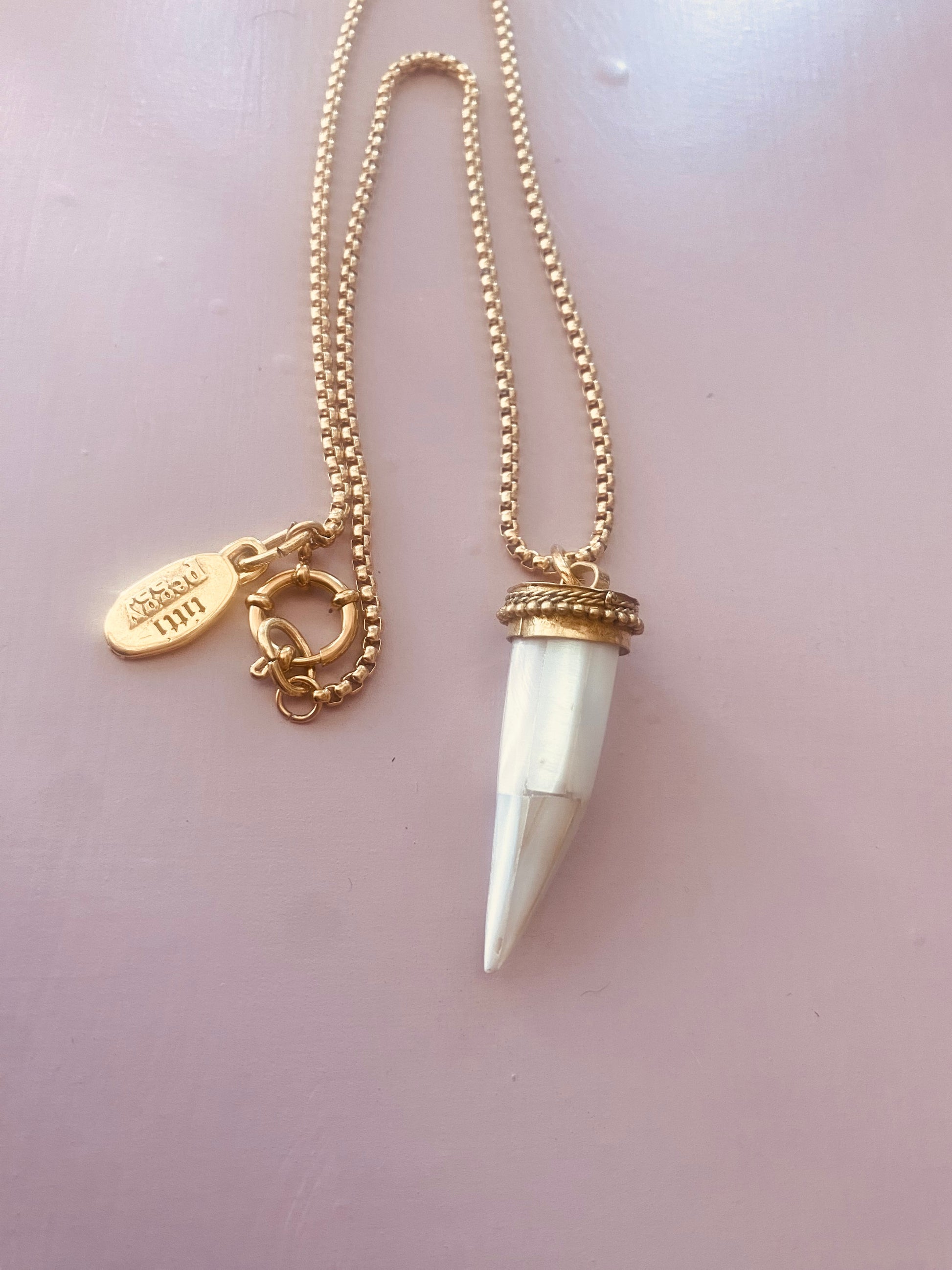 Collana realizzata con catena quadra in acciaio, lunghezza cm .50 cornetto artigianale realizzato con scaglie di madreperla.