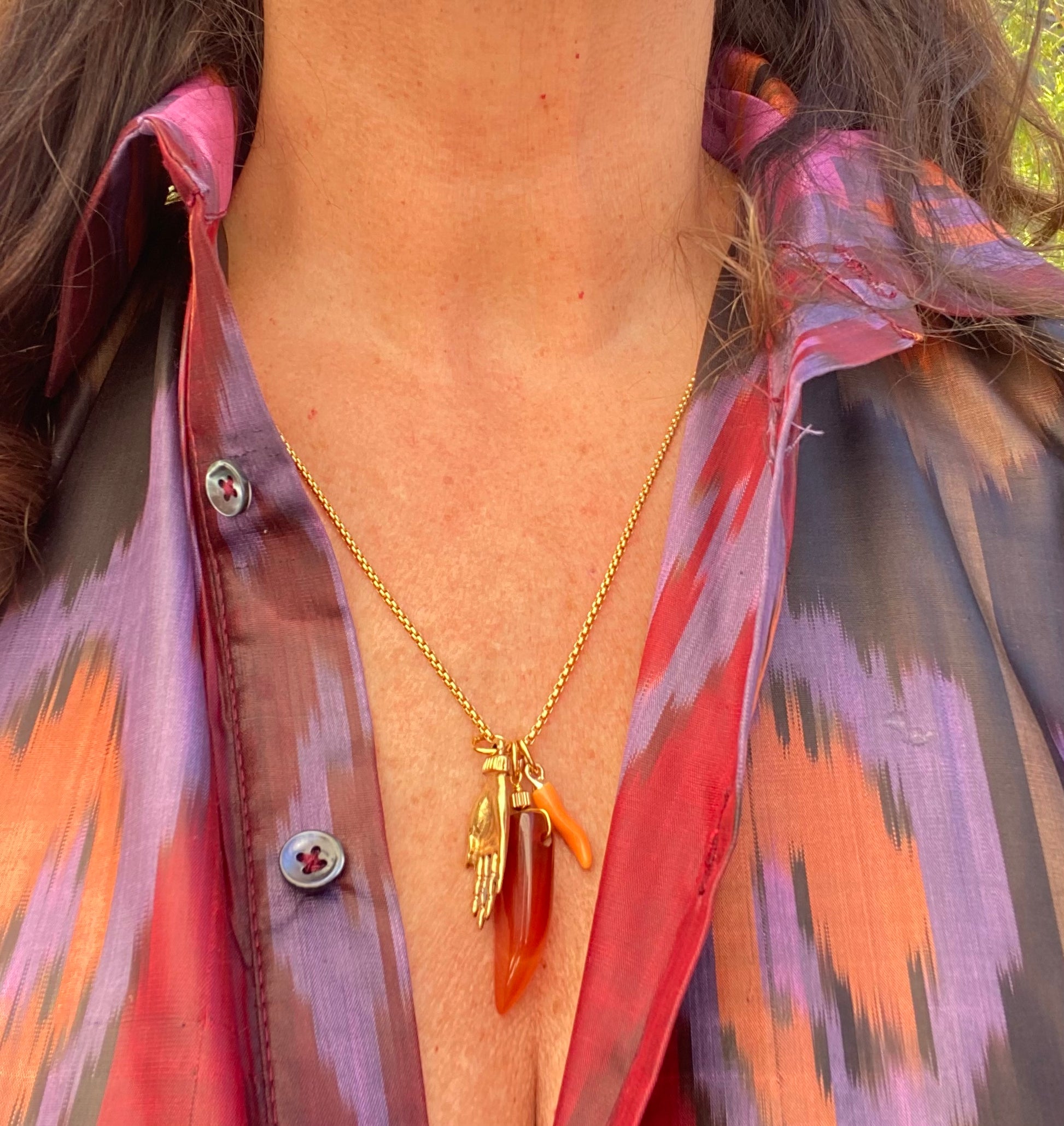 Collana lunghezza cm .60, catena modello “a scatola” in acciaio dorato.Cornetto in pietra dura, charms mano e cornetto smaltato in due varianti di colore. Bella abbinata ad altre collane per creare il mix “confusione chic” che ci piace tanto!