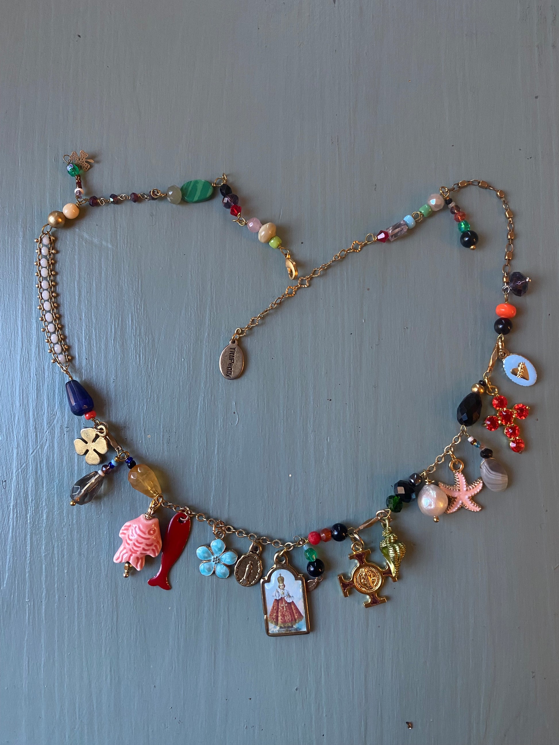 Collana girocollo fantasy realizzata a mano con mix di materiali, tanti charm's a tema animali, portafortuna e varie icone. Ottone, acciaio, pietre semipreziose naturali e cristalli, charm’s smaltati compongono questo oggetto che è un classico di TITTIPEGGY , deve il suo successo anche al fatto che ogni pezzo è unico, lavoriamo ogni stagione con temi e colori diversi seguendo l’ispirazione del momento. Cm.48 circa, la collana è regolabile.Possibili personalizzazioni .
